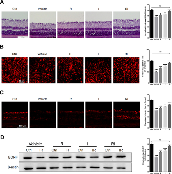 Figure 2: Retinal protection of rasagiline combined with idebenone against RIR injury. (A) HE staining shows the thickness of retinas at day 7 after IR injury. (B) Immunofluorescent staining by Tuj1 on retinal flat mounting displays the survival of RGCs after RIR lesions. (C) Immunofluorescent staining displays BDNF levels (red) in the GCLs of the IR-injured retina. (D) Western blot analysis for the expression level of BDNF in the whole IR-injured retinas. n = 8, ####p < 0.0001, versus control; *p < 0.05, **p < 0.01, ***p < 0.001, ****p < 0.0001, versus vehicle; ns: no significance.