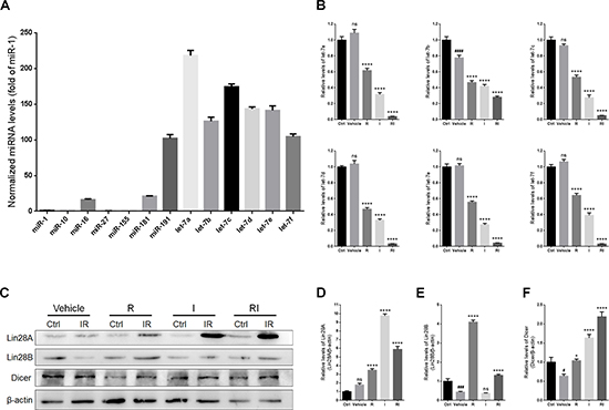 Figure 4: Expressions of Lin28A, Lin28B, Dicer, and the let-7 family in IR-injured retinas. (A) Levels of microRNAs in the uninjured retinas. (B) Levels of let-7 family members in IR-injured retinas. (C) Western blot analysis of Lin28A, Lin28B, Dicer, and β-actin from retinas injured for 7 days. (D) Densitometric analysis of protein expression of Lin28A in injured retinas. (E) Densitometric analysis of Lin28B in injured retinas. (F) Densitometric analysis of Dicer in injured retinas. n = 8, #p < 0.05, ###p < 0.001, ####p < 0.0001, versus control; *p < 0.05, ****p < 0.0001, versus vehicle; ns: no significance.