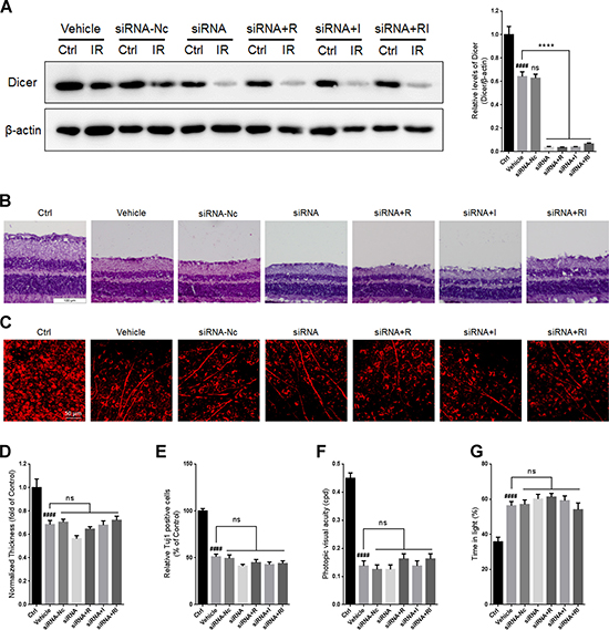 Figure 7: DICER1 knockdown by siRNA in mouse retina. (A) Western blot analysis for Dicer and β-actin in injured retinas after DICER1 knockdown in the eyes. (B) HE staining shows the thickness of retinas injured for 7 days after inhibition of Dicer by siRNA. (C) Immunofluorescent staining of Tuj1 on retinal flat mounting displays the survival of RGCs in IR-injured retinas after DICER1 knockdown. (D) Analysis of retinal thickness of IR-injured retinas after DICER1 knockdown. (E) Analysis of the survival of RGCs in IR-injured retinas by Tuj1 immunostaining on retinal flat mounting after DICER1 knockdown. (F) Photopic visual acuity of RIR-injured mice after inhibition of Dicer by siRNA. (G) Percent time spent in the light chamber by RIR-injured mice after administrated with siRNA for DICER1. n = 8, ####p < 0.0001, versus control; ****p < 0.0001, versus vehicle; ns: no significance.