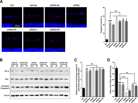 Figure 8: Apoptosis in IR-injured retinas after inhibition of Dicer by siRNA. (A) The percentage of activated caspase-3-positive cells (red) in GCLs of IR-injured retinas after inhibition of Dicer. (B) Western blot analysis for Bcl-2/Bax ratios and activated caspase-3 levelsin IR-injured retinas after administration of siRNA for DICER1. (C) Densitometric analysis of protein expression of activated caspase-3 in IR-injured retinas after DICER1 knockdown. (D) Densitometric analysis of Bcl-2/Bax ratios in IR-injured retinas after DICER1 knockdown. n = 8, ###p < 0.001, ####p < 0.0001, versus control; ****p < 0.0001, versus vehicle; ns: no significance.