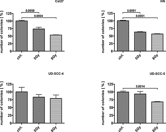 The colony formation assay (CFA) revealed a strong impact of irradiation on Cal27 and HN cells, with almost 50% of the clones not surviving treatment doses of 8 Gy (Cal27, p = 0.0004; HN, p < 0.0001). In contrast, the UD-SCC-4 and UD-SCC-5 cells behaved largely insensitive to irradiation: The clonogenic survival of UD-SCC-4 was not significantly reduced by 5 or 8 Gy treatment doses. UD-SCC-5 survival was significantly reduced only upon irradiation with 8 Gy (p = 0.0014) (Fig. 1) (Suppl. Fig. 2).