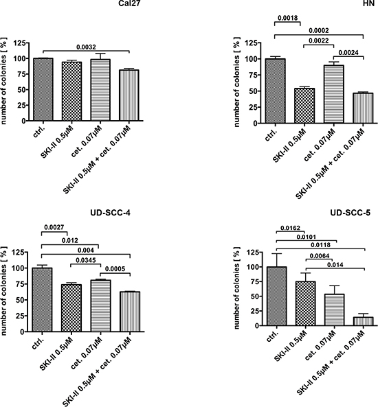 Although the clonogenic survival of UD-SCC-4 and UD-SCC-5 cells was not severely affected by irradiation the outgrowth of these cell lines was significantly inhibited upon treatment with SKI-II and cetuximab in a dose-related manner (Fig. 2). Conversely, the clonogenic formation of the irradiation sensitive Cal27 and HN cells was not impaired upon treatment with SKI-II. The simultaneous administration of both SKI-II and cetuximab significantly reduced the clonogenic survival of UD-SCC-4, UD-SCC-5 and HN but not Cal27 cells (Fig. 2).