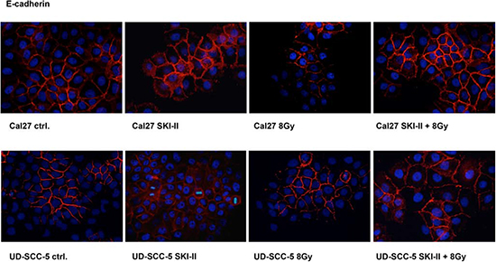 Immunofluorescence revealed reduced E-cadherin expression in Cal27 cells upon irradiation. E-cadherin expression in UD-SCC-5 cells was, however, unaltered upon pretreatment with SKI-II (Fig. 4).