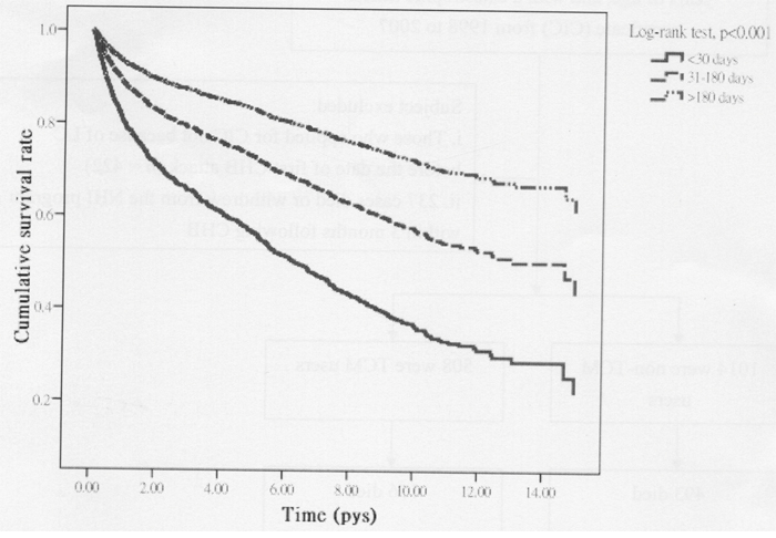 The characteristics of the cohort at baseline were compared by t-tests and χ2 tests. The incidence rate of mortality between 2 groups is the number of cases per 1000 person–years. Hazard ratios and 95% confidence intervals (CI) were derived from Cox proportional hazards regression and met the assumption of proportionality of risks. To adjust for potential confounding in the relationship between the baseline characteristics and the risk of mortality, we further applied multivariate analysis, using Cox regression to rule out the actual effect of CHM on the risk of all-cause mortality. In addition, to test the robustness of the relation between CHM use and the subsequent risk of death, we divided CHM users into 2 subgroups: 1 group used CHM for 30–180 days, and the other group used CHM for > 180 days. Kaplan–Meier survival curves were generated for overall survival probability according to 2 subtypes with respect to CHM use. The Wilcoxon log-rank test was used to examine for differences. Furthermore, if an interaction of age and sex occurred with respect to the risk of death, a stratified analysis by 2 factors was conducted to more accurately determine the relative risk of mortality between CHM users and non-CHM users. All statistical analyses were conducted using SAS version 9.3 (SAS Institute Inc., Cary, NC, USA). A P value of < 0.05 was considered to be statistically significant.