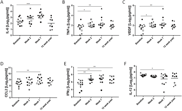 Figure 1: Plasma levels of immune-related mediators in HNSCC patients undergoing CMT. Peripheral blood was collected from HPV+ HNSCC patients before, during and after CMT treatment completion. Plasma samples were analyzed using for Luminex assay to assess the cytokine/chemokine levels. Different symbols were used to indicate samples from various patients; the HPV-positive patients were shown in color (red, blue and green). Fold changes of IL-6 (A), TNFα (B), VEGF (C), CCL2 (D), and IFNγ (E), AND IL-12 (F) are shown; p values were obtained using paired student t-test (baseline n=14, *p<0.05, **p<0.005, ***p<0.0005).