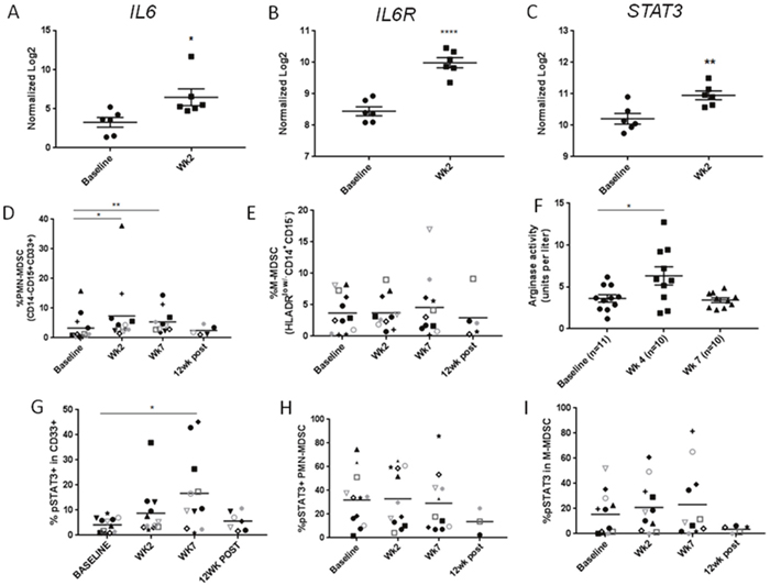 Consistently with the increased level of IL-6 in plasma during CMT, mRNA expression levels of IL6, IL6ST and STAT3 as a downstream signaling molecule were significantly increased in patients’ PBMCs two weeks after initiation of CMT when compared to baseline (Figure 3A–3C). IL-6 is widely recognized for its crucial role in cancer promoting inflammation, which relies on STAT3 as both survival and tolerogenic signaling [20, 21]. IL-6/STAT3 signaling recruits and modulates function of tumor-infiltrating myeloid cell populations in cancer patients [21, 22]. Therefore, we assessed whether increased serum IL-6 level during CMT is reflected by increased percentage of circulating myeloid cells/MDSC as well as STAT3 activation in HPV+ patients. In fact, the percentage of circulating PMN-MDSCs increased significantly over baseline at weeks 2 and 7 during CMT (Figure 3D), but the numbers of M-MDSCs did not change (Figure 3E). Noteworthy, these changes correlated with transient elevation of plasma levels of arginase activity, which is a potently immunosuppressive enzyme inhibiting T cell activity that can be expressed by HNSCC-associated PMN-MDSC in STAT3-dependent manner [23] (Figure 3F). STAT3 activity, detected by tyrosine 705-phosphorylation, was observed in the significant percentage of total CD33+ myeloid cells at week 7 and decreased back to the baseline level at 12 week post CMT (Figure 3G). When we examined the specific MDSC subsets, we found that STAT3 was consistently activated in about 30% of PMN-MDSC and 20% of M-MDSC (Figure 3H and 3I, respectively), but the weak increase during CMT was not significant likely due to various kinetics of STAT3 elevation in different patients. These results suggest that CMT can activate potentially tolerogenic IL-6/STAT3 signaling in circulating myeloid populations.