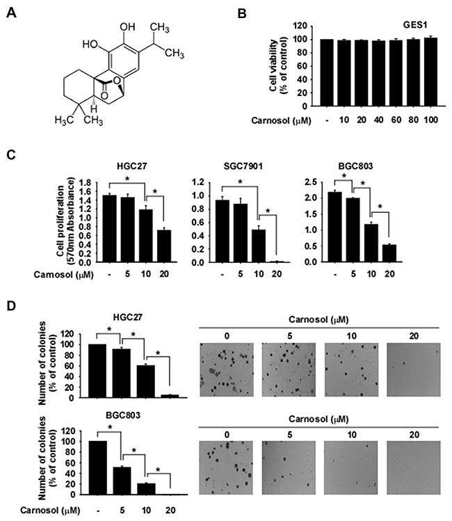Figure 1: Anti-cancer effects of carnosol. (A) Chemical structure of carnosol. (B) Effect of carnosol on the viability of normal gastric cells. Cells were treated with carnosol for 48 h. (C) Effect of carnosol on gastric cancer cell growth. Cells were treated with carnosol at various concentrations and then incubated for 72 h. For (B and C), cell viability and growth were measured at an absorbance of 570 nm. (D) The effect of carnosol on anchorage-independent growth of gastric cancer cells. Cells were treated with carnosol and incubated for 2 weeks. Colonies were counted using a microscope and the Image-Pro PLUS (v.6) computer software program. All data are shown as means ± S.D. of triplicate values from 3 independent experiments and the asterisk (*) indicates a significant (p < 0.05) inhibitory effect of carnosol.