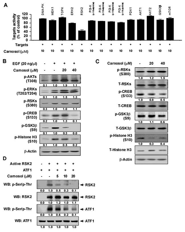 Figure 2: Carnosol is a potent RSK2 inhibitor. (A) Screening ofthe effect of carnosol on various kinases. The effect of carnosol on kinase activity of DNA-PK, MEK1, TOPK, ERK2, RSK2, PI3K (p110α/p65α), PI3-K (p110α/p85α), PI3-K (p110β/p85α), PI3-K (p110γ/p85α), PDK1, AKT1, AKT2, GSK3β or mTOR was determined using active kinases and the specific substrate for each kinase. (B) Effect of carnosol on EGF-induced activation of various signaling proteins in JB6 cells. Serum-starved (0.1% FBS; 24 h) JB6 cells were treated with various doses of carnosol for 1.5 h followed by treatment with EGF for 30 min. (C) Effect of carnosol on various signaling proteins in SGC7901 gastric cancer cells. Cells were treated with carnosol at 20 or 40 μM for 3 h and then signaling pathway proteins were examined by Western blotting. (D) Carnosol suppresses RSK2 kinase activity in a dose-dependent manner. The effect of carnosol on RSK2 activity was assessed by an in vitro kinase assay using RSK2 (active, 300 ng) and ATF1 (substrate, 300 ng) proteins. The effect of carnosol on RSK2 activity was determined by Western blotting. For (B–D) data, similar results were obtained from 3 independent experiments.