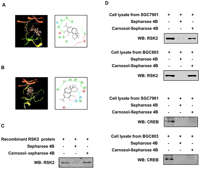 To further study the potential interaction between carnosol and RSK2, we created a computational docking model (using several protocols in the Schrödinger Suite 2016) of carnosol binding at the ATP pocket of NTD RSK2 and CTD RSK2, respectively. The computational docking model results indicated that carnosol formed several contacts with NTD RSK2 and CTD RSK2 at their respective ATP binding pockets (Figure 3A, 3B). Images were generated with the UCSF Chimera software program [34]. Next, to confirm the computational docking results, we performed in vitro pull-down assays with carnosol-conjugated Sepharose 4B beads (or Sepharose 4B beads as a negative control) and a recombinant RSK2 protein or SGC7901 and BGC803 gastric cancer cell lysates. Results indicated that carnosol directly binds to RSK2, but not with CREB in cells (Figure 3C, 3D).