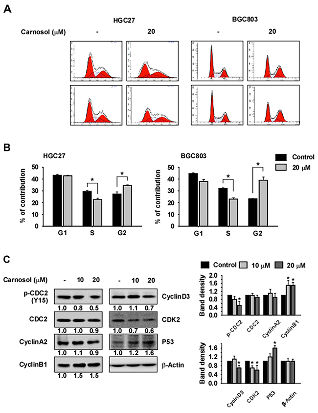Figure 4: Carnosol induces G2/M phase arrest. (A-B) The effect of carnosol on cell cycle was examined in HGC27 or BGC803 gastric cancer cells. Cells were synchronized by serum starvation for 24 h and treated with serum and/or carnosol for 24 h in 10% serum and medium. Cells were stained with propidium iodide(PI) and cell cycle was analyzed by Fluorescence Activated Cell Sorting (FACS). (C) The effect of carnosol on cell cycle marker proteins was determined. Synchronized cells were treated with serum and/or carnosol for 24 h in 10% serum and analyzed by Western blotting. Band density was measured using the Image J (NIH) software program. For (A–C), similar results were observed from 3 independent experiments.