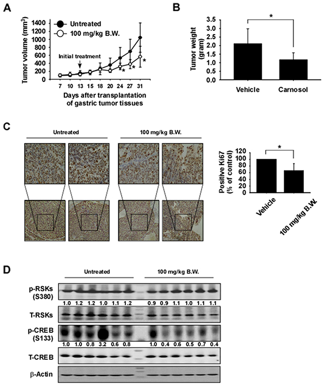 Figure 6: Carnosol attenuates gastric cancer patient-derived xenograft tumor growth in vivo. Mice were divided into 2 groups to assess the effect of carnosol on gastric cancer patient-derived xenograft. Groups are as follows: 1) vehicle group or 2) administration of 100 mg/kg of carnosol. Mice were orally administered carnosol or vehicle 5 times a week for 18 days. (A–B) Carnosol inhibits gastric tumor growth. For (A–B), data are shown as means ± S.E. of values obtained from experiments. The asterisk (*) indicates a significant difference between tumors from untreated or treated mice as determined by t test (p < 0.05). (C) Immunohistochemistry analysis of tumor tissues. Tumor tissues from treated or untreated groups of mice were stained with anti-Ki-67. The number of Ki-67-positive stained cells (right panel) was quantified from immunohistochemistry results (n = 10; *; p < 0.05). (D) Carnosol inhibits RSK-mediated CREB signaling protein expression in gastric tumor tissues. Tumor tissues from each group were immunoblotted with antibodies to detect RSKs, CREB, phosphorylated RSKs, phosphorylated CREB and β-actin. β-Actin was used to verify equal protein loading. Band density was measured using the Image J (NIH) software program.