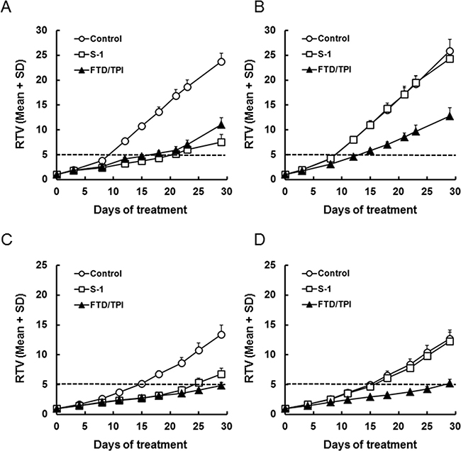 Figure 2: Relative tumor volume (RTV) of xenografted tumors after daily oral administration of FTD/TPI and S-1. Xenografted mice were randomized on day 0. FTD/TPI (150 mg/kg) and S-1 (10 mg/kg) were administered orally twice and once daily, respectively, from days 1 to 14. Data are represented as the mean + SD (n = 8). The horizontal dotted line indicates a relative tumor volume of 5. (A) MKN45, (B) MKN45/5FU, (C) MKN74, and (D) MKN74/5FU.