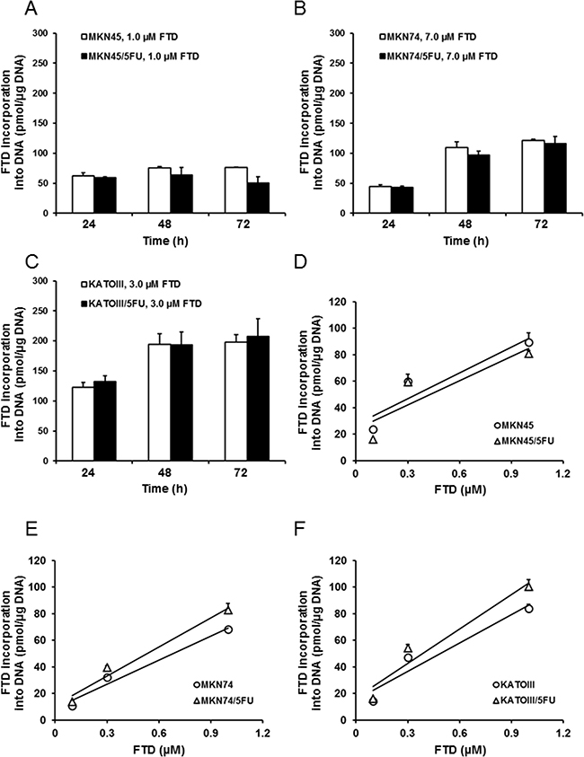 Figure 3: Incorporation of FTD into DNA. DNA incorporation of FTD is shown as time-dependent (A–C) and dose-dependent (D–F) responses. (A) MKN45 and MKN45/5FU, (B) MKN74 and MKN74/5FU, and (C) KATOIII and KATOIII/5FU cells were treated with FTD for 24-72 h. Double-stranded DNA was extracted and FTD incorporation was determined by LC/MS/MS. Data are represented as the mean + SD (n = 3). FTD concentration was positively correlated with incorporation (Pearson correlation coefficients: (D) R2 = 0.85 (MKN45), 0.77 (MKN45/5FU). (E) R2 = 0.97 (MKN74), 0.97 (MKN74/5FU). (F) R2 = 0.92 (KATOIII), 0.93 (KATOIII/5FU)).