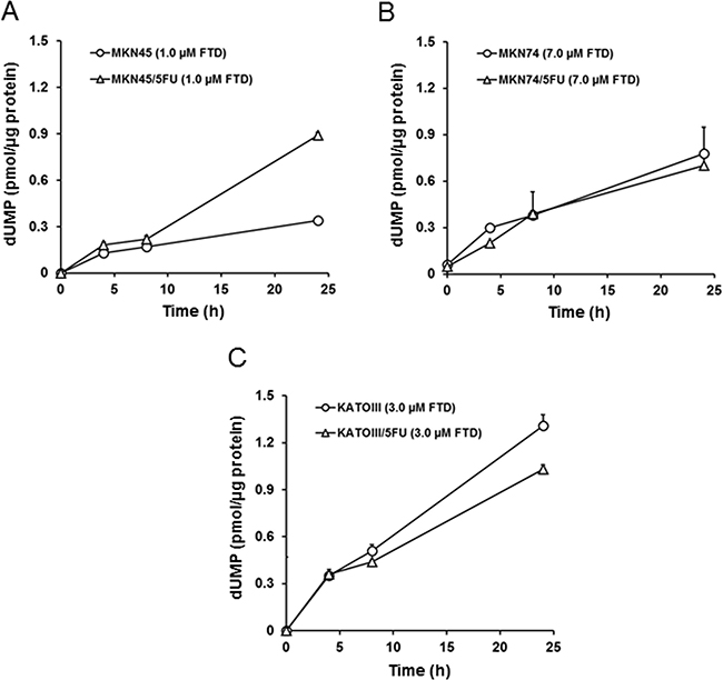 Figure 4: FTD-induced accumulation of dUMP. The cells were exposed for 4, 8, and 24 h to indicated concentration of FTD. The cell dUMP levels were measured using LC/MS/MS. Data are represented as the mean + SD (n = 3). (A) MKN45 and MKN45/5FU, (B) MKN74 and MKN74/5FU, (C) KATOIII and KATOIII/5FU.