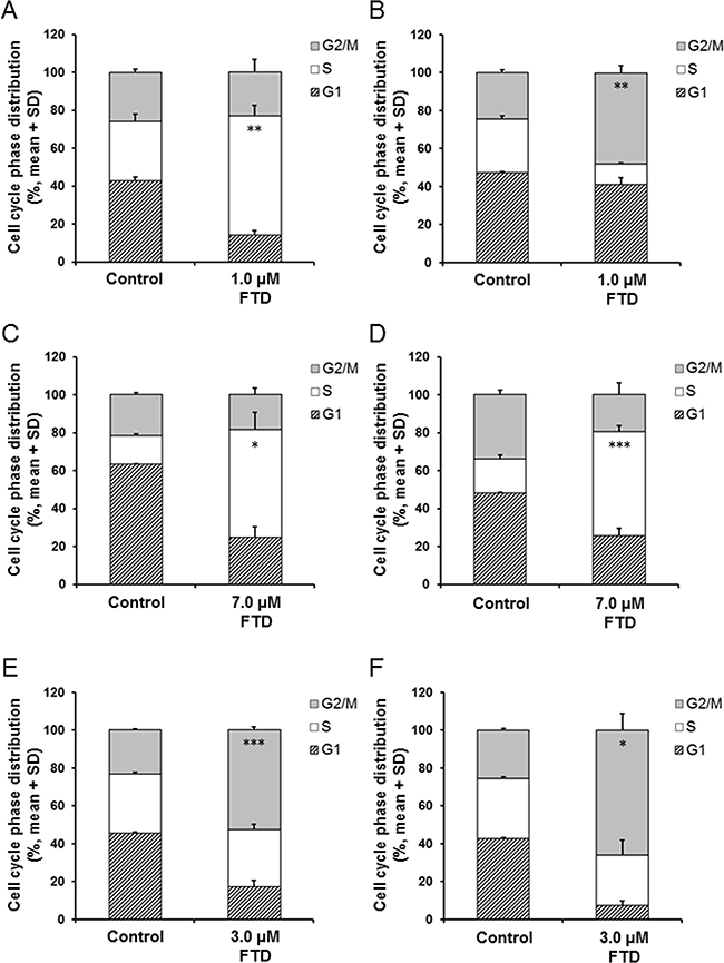 Figure 5: Effect of FTD on cell cycle distribution in parental and 5-FU resistant cells. The cells were exposed for 72 h to indicated concentration of FTD and assayed using flow cytometry. Data are represented as the mean + SD of three independent experiments. *p < 0.05; **p < 0.01; ***p < 0.001. (A) and (B) MKN45 and MKN45/5FU, (C) and (D) MKN74 and MKN74/5FU, (E) and (F) KATOIII and KATOIII/5FU.
