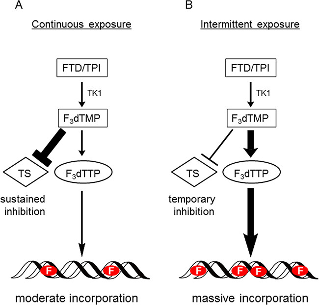 Figure 6: Hypothetical model of action of FTD with continuous exposure or intermittent exposure. (A) When tumor cells are continuously exposed to FTD, such as during in vitro growth inhibition assay, TS inhibition significantly affects cytotoxicity. Therefore, it is presumed that MKN45/5FU cells with high TS expression show partial cross-resistance to FTD. (B) When FTD/TPI is administered orally twice a day (i.e., intermittent exposure), since plasma concentrations of FTD decrease between doses, TS inhibition recovers between doses. It is presumed that DNA incorporation of FTD predominantly induces antitumor effects, since FTD is incorporated into DNA in a concentration-dependent manner under this oral administration condition. Therefore, the cross-resistance to FTD was overcome even in the MKN45/5FU cells with high TS expression. F indicates FTD.