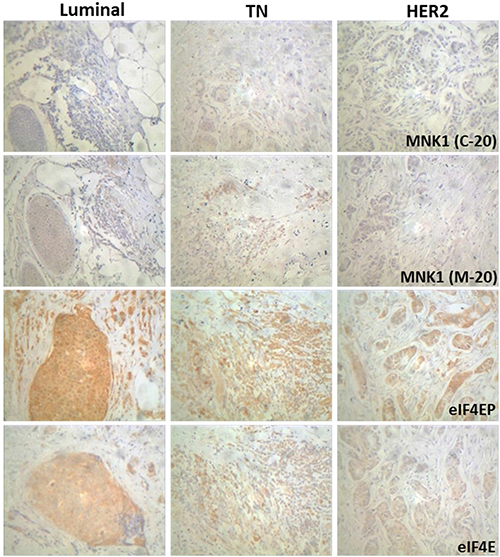 Figure 2: Immunohistochemical staining of MNK1 isoforms, total and phosphorylated eIF4E levels in breast cancer samples. Immunohistochemistry was performed using anti-MNK1 (C-20), MNK1 (M-20), eIF4E(Ser209)P and eIF4E antibodies as described in Materials and Methods section. Representative tumor sections of each molecular types are shown (200×).