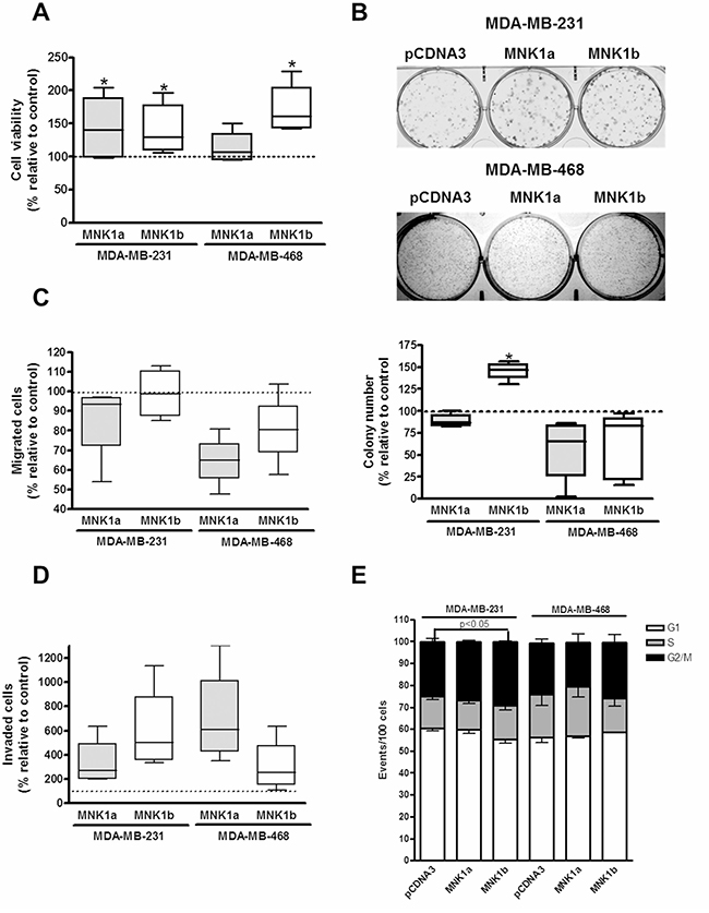 Figure 5: Effect of overexpression of MNK1a and MNK1b on cell viability (A), colony formation (B), migration (C), invasion (D) and cell cycle (E) in triple-negative breast cancer cells. MDA-MB-231 and MDA-MB-468 cells were transfected with Flag-pcDNA3 (control), Flag-pCDNA3-MNK1a (MNK1a) and Flag-pCDNA3-MNK1b (MNK1b) as described in Materials and Methods section. (A) Cell viability assays were performed after 72 h of transfection. (B) After 24 h of transfection, cells were counted and seed at 1 × 103 or 5 × 103 cells/well in six-well plates for MDA-MB-231 and MDA-MB-468 cells, respectively, and, after 12–14 days, the colonies were fixed, stained for 30 min with Giemsa 0.02% and counted. A transwell assay was performed withouth or with matrigel to measured migration (C) and invasion rate (D) respectively. Data are expressed as the percentage relative to the value in control cells and represent the mean ± S.E.M. of 4–6 different experiments. Statistical differences relative to 100; *p < 0.05. (E) Cells were stained with PI and subjected to flow cytometry analysis. The percentage of cells gated in each phase is indicated and represent the mean ± S.E.M. of 3–4 different experiments. Statistical differences relative to the control; *p < 0.05.