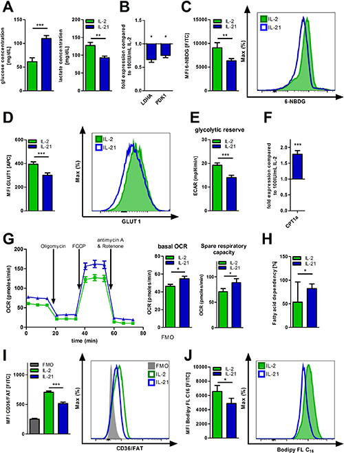 Figure 1: Metabolic reprogramming of IL-21 treated T-cells. (A–J) T-cell culture was performed over 5 days with IL-2 or IL-21 in the presence of activation/expansion beads. (A) Glucose and lactic acid concentrations were determined in the supernatants of IL-21 treated, activated T-cells compared to IL-2 treatment with HITADO Super GL compact (n = 6). (B) After harvesting, lysis and RNA isolation of T-cells, mRNA expression levels of LDHA and PDK1 were analyzed by qPCR (n = 6). (C) Glucose uptake was semi-quantified by flow cytometry using 6-NBDG (n = 6). Left: Summary of MFIs from 6 different donors. Right: representative histogram of one donor. (D) The surface expression of GLUT1 was detected by flow cytometric staining. Left: Summary of MFIs from 6 different donors. Right: representative histogram of one donor. (E) ECAR was measured performing the Glycolysis Stress Test under basal conditions and after inhibitor injections as indicated. Afterwards, glycolytic reserve was calculated. (n = 3). (F) The relative CPT1a mRNA expression was assessed from T-cell lysates obtained from IL-21 cell cultures in comparison to IL-2 (n = 6). (G) OCR was assessed performing the Mito Stress Test under basal conditions and after inhibitor injections as indicated. Afterwards, basal respiration and SRC were calculated as specified by Seahorse Bioscience (n = 3). (H) The dependency of OXPHOS on fatty acid oxidation was measured and calculated using the Seahorse Mito Fuel Flex Test (n = 3). Error bars indicate the standard deviation. (I) Surface expression of CD36/FAT was analyzed by flow cytometry (n = 6). Left: Summary of MFIs from 6 different donors. Right: representative histogram of one donor. (J) For studying uptake of long chain fatty acids, cells were incubated with a fluorescently labeled C16 fatty acid (Bodipy FL C16) and analyzed by flow cytometry (n = 9). Left: Summary of MFIs from 9 different donors. Right: representative histogram of one donor. MFI is defined as median fluorescence intensity. Unless stated otherwise, error bars indicate standard error means. P value: *P < .05; **P < .01; ***P < .001
