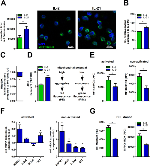 Figure 2: IL-21 increases mitochondrial biogenesis and fitness. (A–F) T-cell cultivation was performed over 5 days with IL-2 or IL-21 in the presence of activation/expansion beads. (A) Mitochondrial mass was visualized using MitoTrackerTM in cytokine-treated T-cells by fluorescence microscopy as shown for one representative donor. Samples were also counterstained with the nuclear dye DAPI. Quantification of MitoTrackerTM fluorescence was done with ImageJ for 5 single cells per condition. (B) The content of mtDNA was determined as the mitochondrial DNA copy number relative to nuclear DNA using qPCR analysis (n = 6). (C) The mitochondrial superoxide production was semiquantified using MitoSOXTM probe with flow cytometry (n = 6). (D) The mitochondrial membrane potential (ΔΨM) was semiquantified by flow cytometry using the potentiometric dye JC-1 (n = 6). In mitochondria with a high membrane potential JC-1 forms aggregates which exhibit a fluorescence emission of higher wavelength (approx. 590 nm). In mitochondria with a low membrane potential JC-1 aggregates separate which feature a shift of the emission to lower wavelength (approx. 530 nm). Hereby, the ratio of both red and green fluorescence allows comparing the membrane potential between the two cell culture conditions. (E) Total intracellular ROS content was detected in IL-21 treated T-cells compared to IL-2 under both non-activating and activating conditions by flow cytometry (n = 6). (F) The relative gene expression of key cellular antioxidants (catalase, CAT; heme-oxygenase-1, HMOX1; glutamate cysteine ligase catalytic subunit, GCLC; glutamate cysteine ligase modifier subunit, GCLM) is shown for IL-21 treated T-cells in relation to IL-2 treated counterparts as quantified by qPCR (n = 6). (G) CLL PBMCs with less than 70% CD5+ B-cells were cultured for 5 days in the presence of IL-2 or IL-21 with anti-CD2/CD3/CD28 beads. Total cells were incubated with MitoSOXTM for mitochondrial superoxide production and CellROXTM for total intracellular ROS level. For analysis of T-cells, cells were gated according to their CD3 expression. MFI is defined as median fluorescence intensity. Error bars indicate the standard error means. P value: *P < .05; **P < .01; ***P < .001