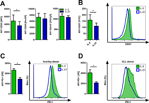 T-cell senescence and (pseudo-)exhaustion are regularly described in tumor patients including CLL [27] and represent an important immune escape mechanism. They are caused by chronic activation and/or inhibitory signals. We cultured T-cells under conditions of persistent activation for five days by adding stimulatory anti-CD2/CD3/CD28 beads +IL-2 or +IL-21 and evaluated expression of senescence and exhaustion markers. Incubation with IL-21 significantly decreased surface expression of CD57, a marker for replicative senescence [28], and of PD-1 (Figure 3B–3C). Interestingly, adding IL-21 to IL-2 T-cell cultures seems to antagonize IL-2 induced exhaustion (Supplementary Figure 3A). Furthermore, CLL T-cells are characterized by an increased expression of PD-1 as compared to healthy donor T-cells [29], which can be reduced in vitro by IL-21 application (Figure 3D).
