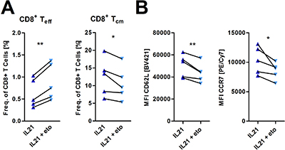 Since Tregs are similar to memory T-cells dependent on FAO for meeting their energetic demands we sought out to investigate, whether IL-21 promotes their expansion. Gene expression of FOXP3 and IL-10 both linked to Treg differentiation was reduced which is in line with previous observations of IL-21 counteracting Treg induction and suppressivity [21, 22]. Additionally, we observed a decreased expression of CD25 which was recently described as a possible mechanism of IL-21 mediated Treg inhibition [47]. Overall, all tested immunometabolic parameters point towards promotion of memory T-cells by IL-21, which we confirmed by the according phenotypical analyses [48]. As anticipated, preclinical data suggests similar in vivo effects as IL-21 application has been shown to support CD4+ and CD8+ memory Tcell formation during amongst others viral infections [19, 20, 49]. In fact, recombinant IL-21 has been utilized in early clinical trials in cancer patients with e.g. melanoma or colorectal cancer [50, 51] and observations indicate an enhanced T-cell activity. However, in depth immune compartment analyses (including T-cell differentiation and/or exhaustion) have not been performed, which might be of high interest for future trials. As previously described by Kastirr et al., increase was restricted to the central memory T-cells while effector memory subsets decreased [52].