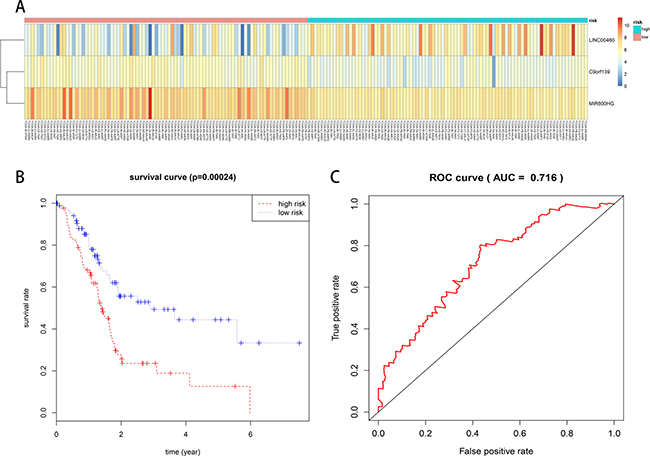 Figure 6: Prognostic evaluation of the 3-lncRNA signature in PAAD patients. (A) Expression heat-map of 3 prognostic lncRNAs. (B) Kaplan–Meier survival curve analysis for overall survival of PAAD patients using the 3-lncRNA signature. (C) ROC curve analysis of the 3-lncRNA signature.
