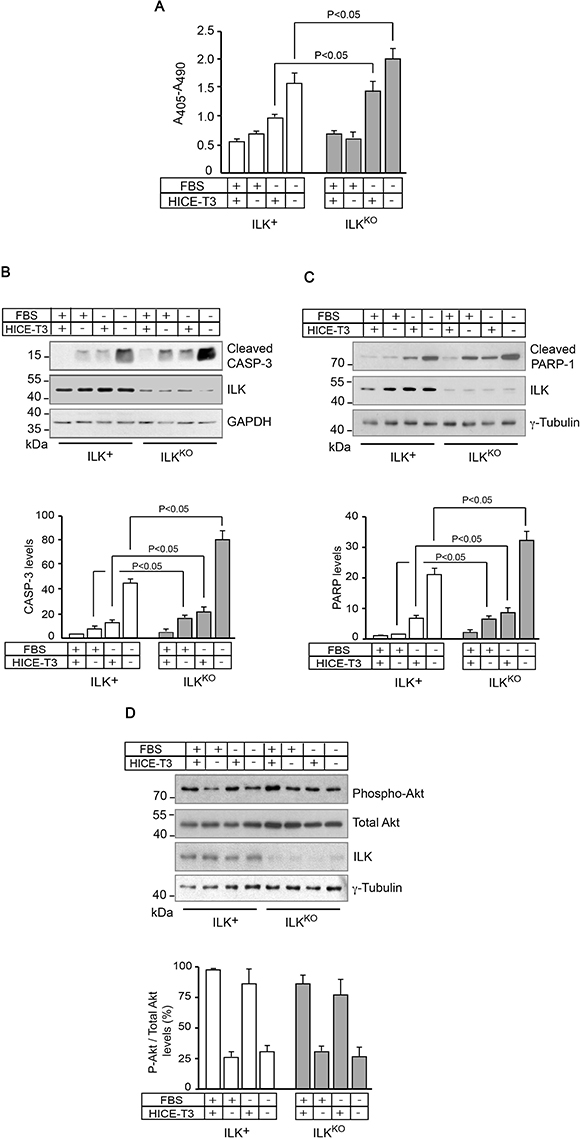 Figure 1: Increased sensitivity of ILKKO keratinocytes to growth factor deprivation. ILK+ and ILKKO keratinocytes were cultured in the presence of the indicated additives for 24 h. (A) Cytoplasmic mono- and oligonucleosomes in keratinocyte lysates were quantified using a colorimetric enzyme-linked immunosorbent assay method. The results are expressed as mean absorbance at 405 nm (reference wavelength 490 nm) ± SEM (n = 7). Statistical significance was calculated using ANOVA. (B–D) Cell lysates were analyzed by immunoblot using antibodies against the indicated proteins, and GAPDH or γ-tubulin served as loading controls. The histograms below each representative immunoblot show normalized densitometric quantification of each protein (mean ± SD; n = 3), and are expressed relative to the abundance in ILK+ cells cultured in growth medium with FBS and HICE-T3, which is set to 1.0. Statistical significance was calculated using ANOVA. CASP-3, caspase 3.