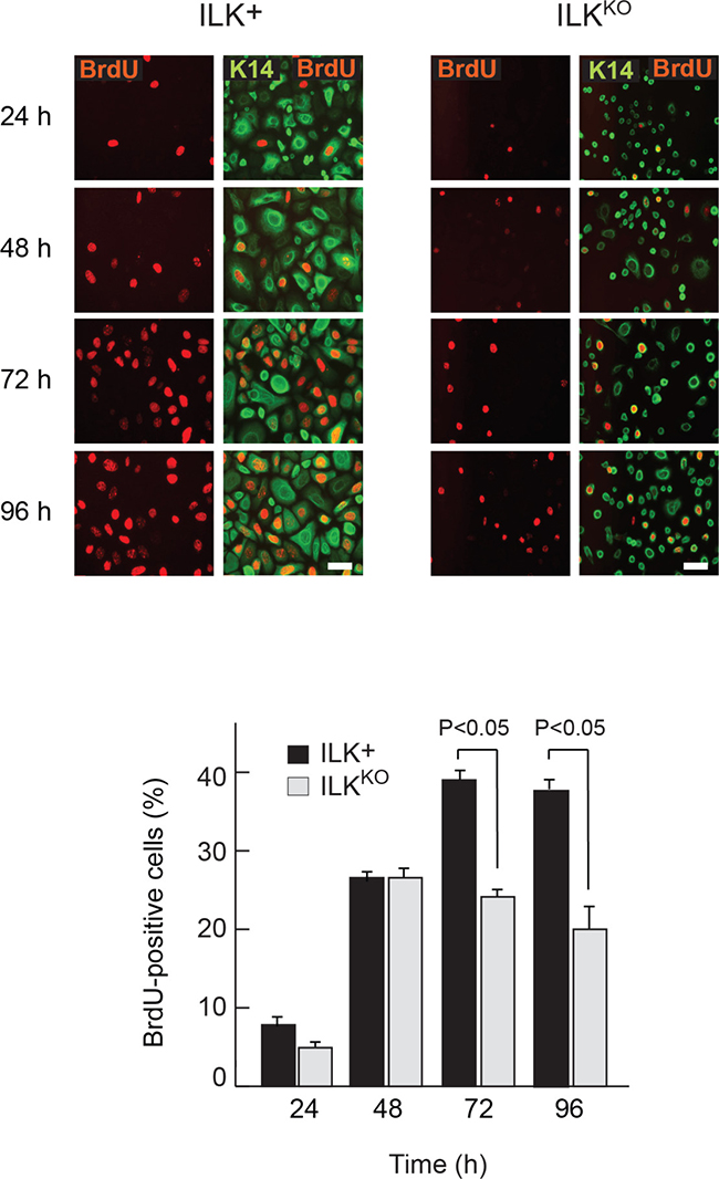 Figure 2: Proliferation defects in ILKKO keratinocytes. Representative micrographs of keratinocytes incubated in the presence of 10 μM BrdU for 2 h prior to processing for immunofluorescence microscopy using anti-BrdU and anti-keratin 14 (K14) antibodies at the indicated times following isolation and plating. Bar, 60 μm. The histograms indicate the fraction of BrdU-positive cells of each genotyope, represented as the mean + SEM (n = 3). Statistical significance was calculated using ANOVA.
