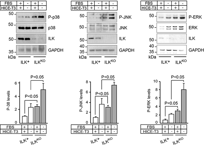 Figure 3: Increased levels of phosphorylated MAP kinases in ILKKO keratinocytes. Keratinocytes were cultured in the presence or absence of growth additives. After 24 h, cell lysates were prepared and analyzed by immunoblot using antibodies against phosphorylated (P-) or total cellular p38, JNK or ERK; GAPDH served as loading control. The histograms under each representative immunoblot show the densitometric quantification of each phosphorylated protein normalized to the corresponding levels of total protein (mean ± SD; n = 4). Statistical significance was calculated using ANOVA.