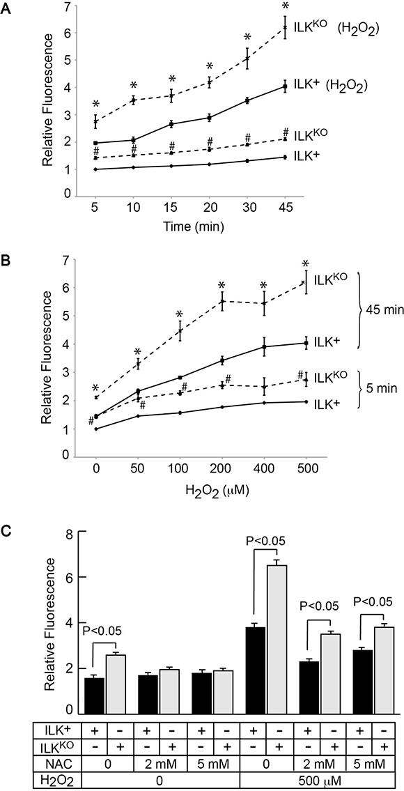 Figure 4: Increased intracellular oxidant species in ILKKO keratinocytes. Cells were loaded by culture at 37° C in the presence of 10 μM DCFDA. (A) After DCFDA removal, fluorescence values were determined at the indicated times in cultures incubated with or without 500 μM H2O2, and were normalized for cell number. The results are expressed as fold-change relative to the 5-min normalized fluorescence value in ILK+ cultures incubated without H2O2, which is set to 1. Data are means ± SEM (n = 3). # and *represent, respectively, P < 0.05 relative to ILK+ cells in the absence or presence of H2O2 at the corresponding time (ANOVA). (B) After DCFDA removal, fluorescence values were determined after 5 or 45 min in cultures incubated with the indicated H2O2 concentrations, and were normalized for cell number. The results are expressed as fold-change relative to the 5-min normalized fluorescence value in ILK+ cultures incubated without H2O2, which is set to 1. Data are means ± SEM (n = 3). # and *represent, respectively, P < 0.05 relative to ILK+ cells in the absence or presence of H2O2 at the corresponding time (ANOVA). (C) Keratinocytes were incubated with the indicated NAC concentrations for 45 min and, after NAC removal, were loaded with DCFDA and fluorescence was measured as described in (B). The results are expressed as fold-change in cultures measured after 45 min, relative to the 5-min normalized fluorescence value in ILK+ cultures incubated without NAC and H2O2, which is set to 1. Data are means ± SEM (n = 3). Statistical significance was calculated using ANOVA.