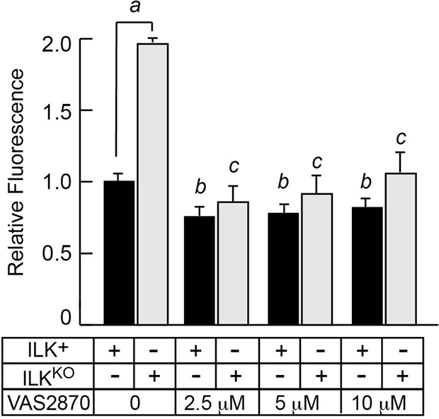 Figure 5: Inhibition of NADPH oxidase activity decreases intracellular oxidant species in ILKKO keratinocytes. Keratinocytes were cultured in the presence of the indicated concentrations of VAS2870 for 24 h. After removal of the drug, the cells were loaded by incubation at 37° C in the presence of 10 μM DCFDA. Following DCFDA removal, fluorescence values were determined after 45 min, and were normalized for cell number. The results are expressed as fold-change relative to the normalized fluorescence value in ILK+ cultures incubated without VAS2870, which is set to 1. Data are means + SEM (n = 3). aP < 0.05, bP < 0.05 relative to ILK+ cells in the absence of VAS2870, cP < 0.05 relative to ILKKO cells in the absence of VAS2870 (ANOVA).