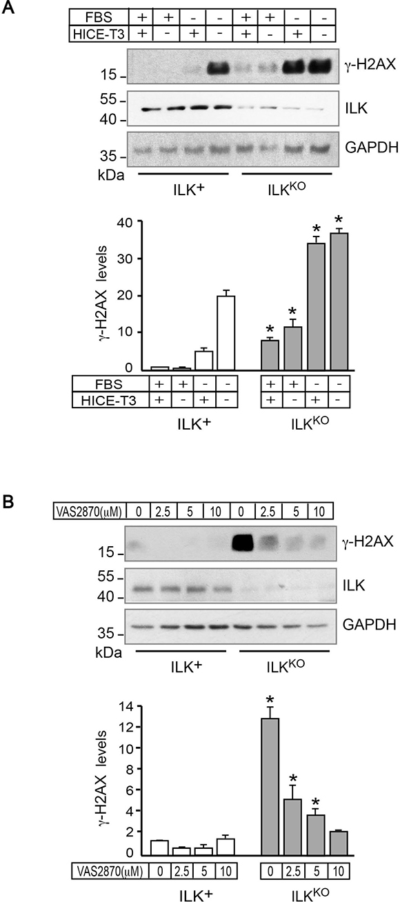 Figure 6: NADPH oxidase-dependent presence of γH2AX in ILKKO keratinocytes. (A) ILK+ and ILKKO keratinocytes were cultured with the indicated growth additives for 24 h. Cell lysates were prepared and 10 μg/sample were analyzed by immunoblot using antibodies against the indicated proteins; GAPDH served as loading control. The histograms under the representative immunoblot show γH2AX densitometric quantification (mean ± SD, n = 3), and are expressed relative to levels in ILK-expressing cells cultured in growth medium containing FBS and HICE-T3, set to 1. *P < 0.05 (ANOVA), relative to γH2AX levels in ILK+ cells cultured in the corresponding culture condition. (B) Keratinocytes were cultured in the presence of the indicated concentrations of VAS2870 for 24 h, and the indicated proteins were analyzed as described in (A), using 80 μg of protein lysate/sample, to better visualize dose-dependent VAS2870 reductions in γH2AX. The histograms under the representative immunoblot show γH2AX densitometric quantification (mean ± SD, n = 3), and are expressed relative to the level in ILK+ cells cultured in the absence of drug, which is set to 1. *P < 0.05 (ANOVA).