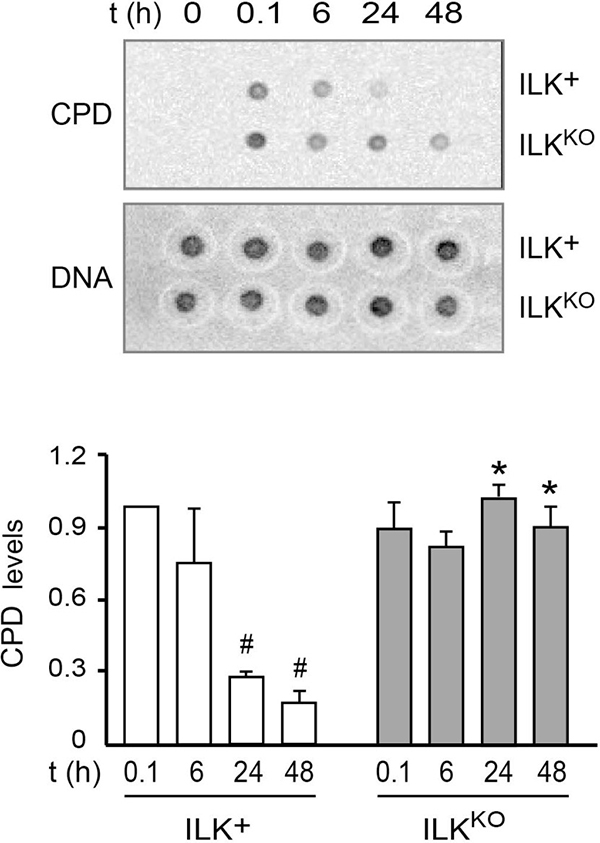 Due to their location on the body surface, epidermal keratinocytes are constantly exposed to damage from UV light and environmental oxygen. Given the increased oxidative stress of ILKKO cells, we next examined their capacity to repair UV-induced DNA damage. To this end, we subjected the cells to UV irradiation to induce CPD formation in genomic DNA, and measured their ability to repair those lesions as a function of time. ILK-expressing keratinocytes showed maximum CPD levels immediately after UV irradiation, which decreased by 80% and 95%, respectively, after 24 h and 48 h (Figure 7). UV irradiation of ILKKO cells produced similar initial CPD levels to those observed in normal keratinocytes. However, CPD abundance in these cells remained unchanged even 48 h after irradiation, indicating that lack of ILK expression also reduces the DNA repair capacity of the cells.