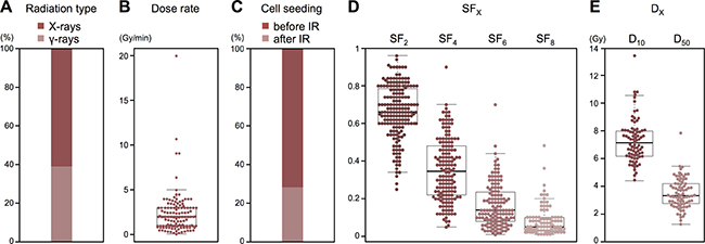 Figure 1: Summary of clonogenic assay data acquired from publications. (A) Radiation type (n = 188). (B) Dose rate (n = 144). (C) Timing of cell seeding (n = 192). (D) SF2 (n = 179), SF4 (n = 156), SF6 (n = 136), and SF8 (n = 92). (E) D10 (n = 79) and D50 (n = 79).