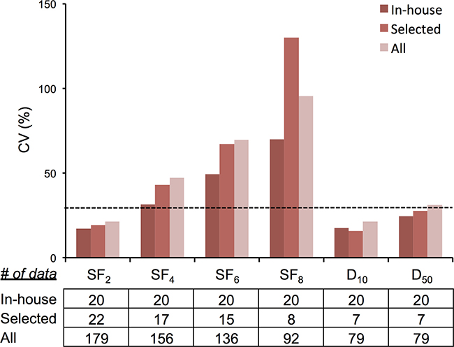 Figure 3: CV values of clonogenic survival. In-house, data from in-house experiments. Selected, data from selected publications that employed the following experimental settings: radiation type: X-rays; dose rate: 1.14 ± 0.5 Gy/min; and timing of cell seeding: before irradiation. All, data from all publications. Dotted line indicates CV of 30%.