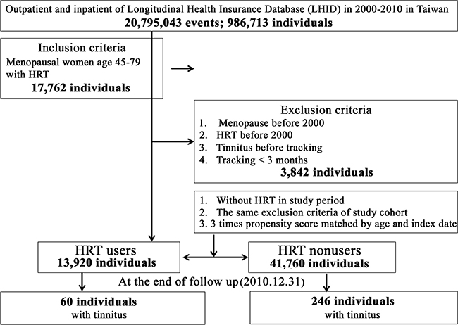 In this study, we acquired data from the National Health Insurance Research Database (NHIRD, outpatient and hospitalization Longitudinal Health Insurance Database in Taiwan) to investigate the association between HRT and subsequent development of tinnitus in menopausal women over a 10-year period (2000–2010) .