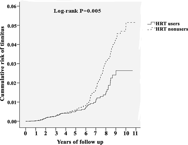 The cumulative incidence curve of tinnitus for the HRT users cohort was significantly lower than the comparison cohort after age and variable adjustments (Figure 2, Log-rank test P = 0.005). In menopausal women with HRT, risk of tinnitus decreased progressively with increasing duration of follow-up.