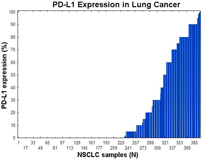 Figure 2: PD-L1 expression in NSCLC using immunohistochemistry using SP147 PD-L1 clone. The tumor proportion score (TPS) is shown.