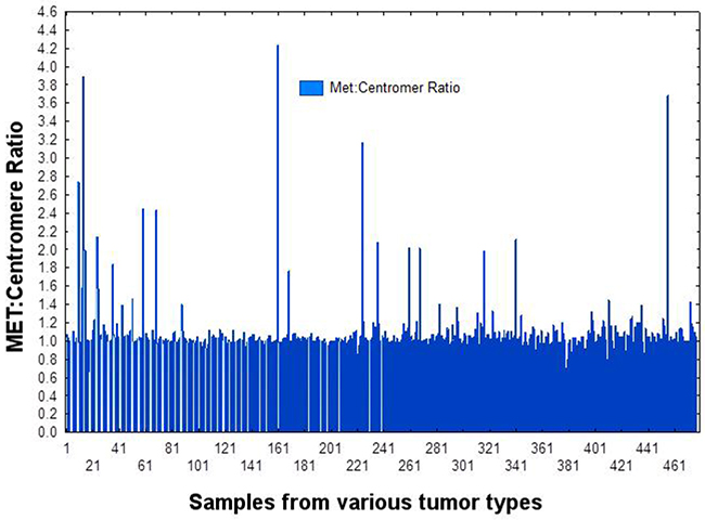 In this retrospective study, tissue sampled collected from 471 patients with various tumors, including 397 lung cancers, were tested for MET gene amplification by FISH by using a MET (7q31) probe and centromere 7 as a control (Agilent, Santa Clara, CA). Signals were quantified and ratios were calculated.