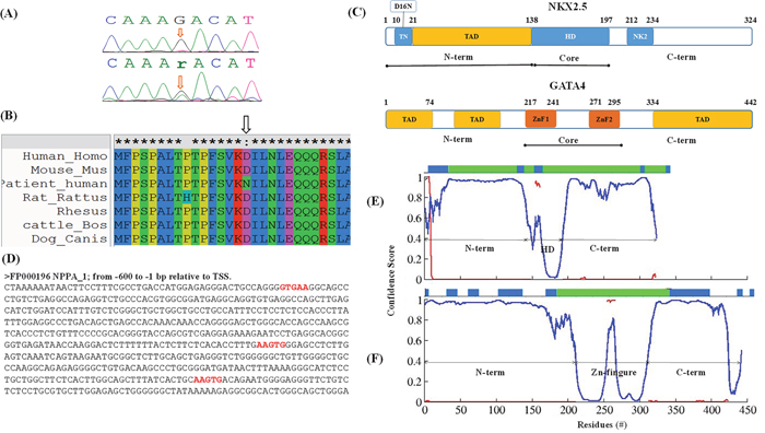 Figure 1: (A) DNA sequencing electropherogram showing wild type (upper panel) and heterozygous (G → A) mutation (lower panel) in NKX2.5 coding region (arrows), mutation D16N, (B) Multiple amino acid sequence alignment of different species shows the conservation of the mutated amino acid residue (amino acid marked) across species. (C) Schematic diagram of NKX2.5 and GATA4. NKX2.5: structure/architecture depicting the location of a novel mutation D16N; N-term, amino-terminal region; TN, tin-man domain; HD, homeo-domain; NK2, nucleotide kinase domain-2; C-term, carboxy-terminal region. GATA4: TAD, transcription activation domain; two Zn finger motifs, ZnF1 (BR2) and ZnF2 (BR1). Three regions, N-term (amino-terminal region); core and C-term (carboxy-terminal region) are mentioned. The molecular modeling studies were conducted on N-term + core in case of NKX2.5, and only core in GATA4, is highlighted by horizontal black lines. (D) Sequence of Atrial natriuretic factor (ANF) promoter region from −600bp to −1bp. The motifs shown in red color are potential binding motifs for human NKX2.5 in human ANF promoter, identified from literature. In panels (E and F) Structural disorder and globularity predictions: the disorder regions (confidence score higher than 0.5) are shown by blue lines and protein binding region shown by red lines. Confidence score shown in Y-axis, and residues in X-axis. Globularity prediction is shown as horizontal bar at the top, disordered region (in blue), ordered region (in green) and the gaps represent coil regions, (E) NKX2.5 and (F) GATA4.