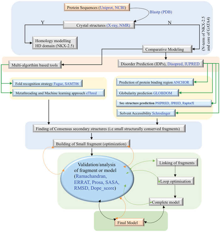 To conduct the 3D model of NKX2.5, the BLAST (from NCBI) was performed with the aim to identify the existing crystal structures with high identity and similarity. Additionally, we performed disorder tendency and protein binding analysis through DISOPRED, which highlight the probability estimation of each residue in the sequence. All details of the molecular modeling of the NKX2.5 model (N-term + HD) and GATA4 model were given in the material and method section in supplementary file. We have also described the method part of, finding of NKE motif in ANF promoter and Preparation of DNA, protein-DNA docking (NKX2.5-DNA), protein-protein docking (P-P docking) of NKX2.5-GATA4 complex in details in the material and method section in supplementary file.