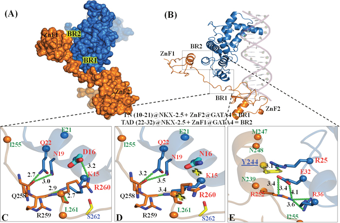 We identified a novel D16N mutation in NKX2.5 by screening 100 South Indian CHD patients. We are elucidating the molecular basis as how this mutation becomes pathogenic and cause CHD through protein-protein interaction study. The structural localization of D16N mutation and their atomic level resolution showed as how this mutation alters the architecture of functional protein-protein and/or protein-DNA interactions. Additionally, we also tried to explore the structural understanding of disease associated reported mutations. It is known that GATA4-NKX2.5 partnership may represent a paradigm for transcription factor interaction during organogenesis [5]; however, the mode of interaction has not been reported yet. The protein-protein interaction between NKX2.5 and GATA4 provides the structural insights as how D16N mutation perturbed the structural-functional relationship, which might be responsible for pathogenicity.