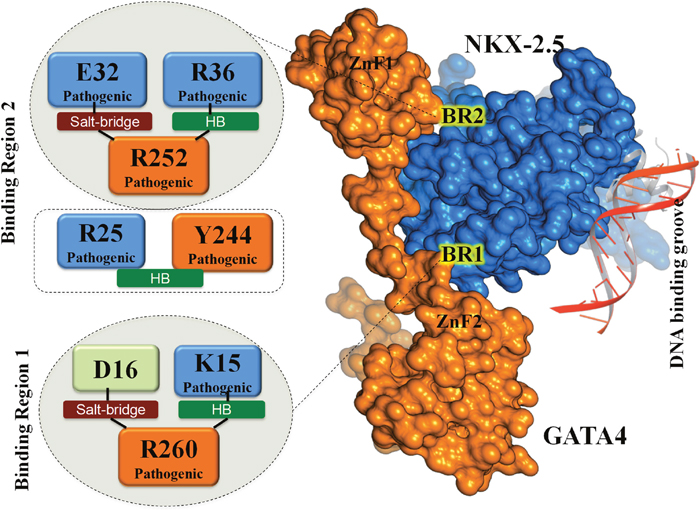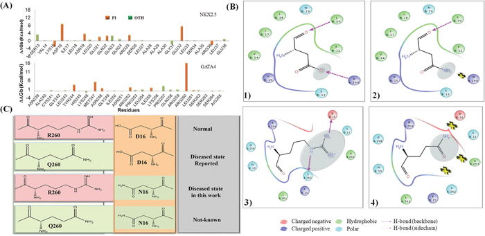 Other residues of NKX2.5 (N19 and Q22) and GATA4 (Q258 and R259) are also contributing in zipping the NKX2.5-GATA4 interactions at BR1 and BR2 sites by making hydrogen bonds. In general, these two TFs are mostly unstructured disordered form. For regulation of transcription, these two TFs come close together at some binding sites and the binding regions are transformed from unstructured-to-structured form. It seems that the hydrogen bonds between K15, D16, N19, Q21 and R25 of NKX2.5 and Y244, Q258, R259 and R260 of GATA4 at BR1 and BR2 sites are acting like a “zip” to hold the interactions at these two sites. The regions of GATA4 which interact with D16@NKX2.5 are unstructured, flexible and have two reported phosphorylation sites i.e. S262 and S264. The phosphorylation at these sites might induce the conformational change and possibly play a role in on/off switching mechanism pattern during interaction between NKX2.5-GATA4. The phosphorylation sites are known to induce some conformational changes and helping to regulate transient interactions specially at interfaces and binding hot-spot. [48, 49] Result of residue wise analysis and in-silico alanine scanning mutagenesis have given clue that the interface site BR1 and BR2 act as binding hot spot, and residue [email protected] act as a key hot spot residue. Interestingly, except D16, all other residues are reported as pathogenic mutations indicating the importance of BR1 and BR2 sites for transcription regulation (Figure 6 and 7). The genetic variations of BR sites residues have already been documented to perturb the transcriptional regulation. We have noticed that D16 residue directly perturb the hydrogen bond with R260 of GATA4 and parallel hindering other key interactions too. These alterations at residue level induce significant structural conformation-orientation changes and loss of secondary structures, by which it unzips the binding of NKX2.5 and GATA4 at BR sites and induces perturbed transcription regulation. Therefore, we concluded that D16N mutation of NKX2.5 might be pathogenic as the variation in this residue, not only become a cause of losing the hydrogen bond with R260 of GATA4, also perturbing the interaction pattern at BR1 and BR2 sites significantly. The perturbation of this interaction may impair the downstream pathways crucial for heart development. It is reported that protein NKX2.5, has an autoinhibitory domain and, alone does not have significant effects on the expression of downstream target genes such as A1 adenosine receptor, α-cardiac actin, cardiac troponin T, cardiac ankyrin repeat protein, leucine-rich repeat containing 10 and inhibitor of differentiation/DNA binding-2. Direct physical-interaction of NKX2.5 with GATA4 is crucial to regulate the expression of the above essential cardiac genes in a synergistic manner [5, 50, 51]. It is well established that NKX2.5 cooperatively with GATA4 facilitates its activating and repressing functions. The interaction between NKX2.5 and GATA4 might also be important for the function as a repressor of ion channels and its downstream target genes. Therefore, We hypothesized that the mutation D16N possibly destroy or lose the interaction between NKX2.5 and GATA4 and thus may altered the transcription regulation and eventually leads to loss of several activator and repressor function of this complex.