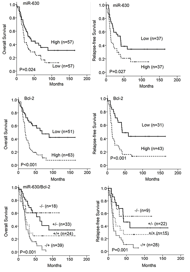 Figure 1: The expression of miR-630 and Bcl-2 in tumors was associated with overall survival (OS) and relapse free survival (RFS) in patients with lung cancer. Patients with tumors showing low-miR-630 and high-Bcl-2 expression had poor outcomes.