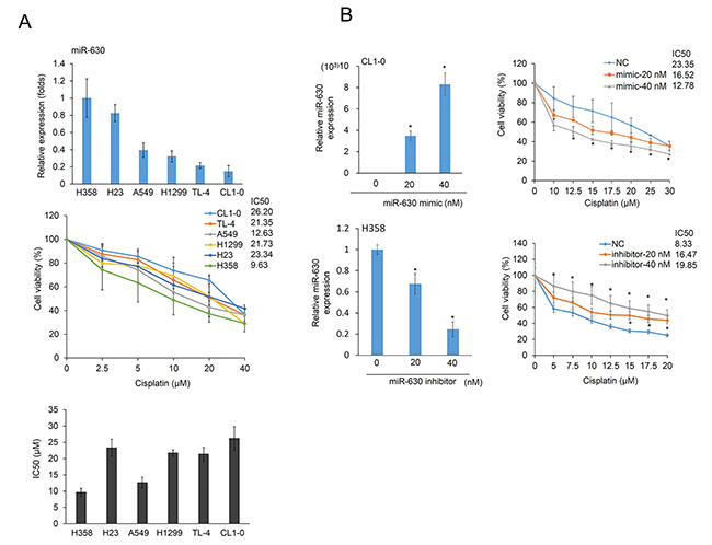 Six NSCLC cell types were collected to evaluate miR-630 expression levels by real-time PCR. The highest miR-630 expression was observed in H358 cells, followed by H23, A549, H1299, TL4, and CL1-0 cells (Figure 2A upper panel). The MTT assay was performed to calculate the inhibitory concentration of cisplatin yielding 50% viability (IC50) in these six cell types. The highest IC50 value for cisplatin was observed in CL1-0 cells, followed by TL4, H1299, H23, and A549 cells (Figure 2A low panel). In general, miR-630 expression levels were negatively associated with the IC50 value for cisplatin in these cell types, except in A549 cells. The low miR-630 expressing CL1-0 and the high miR-630 expressing H358 cells were selected for further miR-630 manipulation using a miR-630 mimic and inhibitor. The expression levels of miR-630 in both cell types were increased and decreased by miR-630 manipulation in a dose-dependent manner (Figure 2B left panel). The MTT assay indicated that the IC50 value for cisplatin in CL1-0 cells was markedly decreased by transfection of a miR-630 mimic; conversely, the IC50 value for cisplatin in H358 cells was significantly increased by treatment with a miR-630 inhibitor (Figure 2B right panel). These results indicated that low miR-630 expression may confer cisplatin resistance in NSCLC cells.