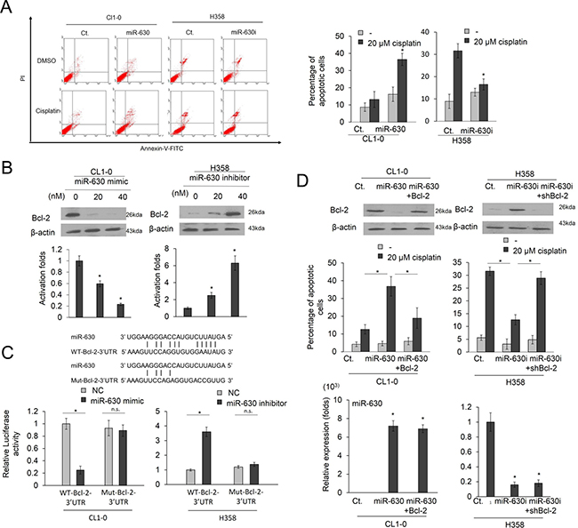 Figure 3: Low miR-630 expression may confer cisplatin resistance and promote colony formation by de-targeting Bcl-2. (A) MiR-630 inhibitor were transfected into H358 cells. MiR-630 mimics were transfected into CL1-0 cells. After 24 h, these cells were treated with 0.1% DMSO or 20 μM cisplatin for 48 h and then subjected to annexin-V and PI staining, followed by flow cytometry analysis. The percentages of apoptotic cells included with the annexin V+/PI- population plus annexin-V+/PI+ are summarized. (B) MiR-630 inhibitor were transfected into H358 cells. MiR-630 mimics were transfected into CL1-0 cells. After 48 h, the cells lysates were evaluated for the expression of Bcl-2 expression by real-time PCR and western blotting. (C) Top: The miR-630 binding sequence of wild-type (WT) or mutant (Mut) Bcl-2-3ʹ-UTR were synthesized and ligated with pmiR-REPORT miRNA Expression Reporter Vector. Bottom: CL1-0 and H358 cells were transfected with miR-630 mimic, miR-nonspecific control, pMIR-Reporter luciferase vector, including 3ʹ-UTR of Bcl-2 (with WT or mutant miR-630 response element) and β- galactosidase plasmid. In all experiments, the relative level in the NC controls was arbitrarily assigned as 1. (D) CL1-0 cells were transfected with the indicated combination of miR-630 mimics and Bcl-2, overexpression plasmids for 24 h. H358 cells were transfected with the indicated combination of miR-630 inhibitor and shBcl-2 for 24 h. These cells were treated with 0.1% DMSO or 20 μM of cisplatin for 48 h and were subjected to annexin-V and PI staining, followed by a flow cytometry analysis. The percentages of the apoptotic cells in the annexin V+/PI- population plus annexin-V+/PI+ are summarized. P value was calculated by the Student’s t-test. The significant differences in experimental groups were compared to vehicle or indicated treatment (*P < 0.05). N.s.: Non-significant.