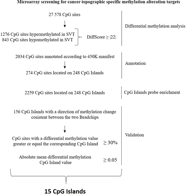 The differential methylation probes were selected based on a DiffScore ≥ |22| and annotated according to the HumanMethylation450 (450K) manifest. The annotated probes on sex chromosome were excluded and only those present on a CpG Island were used for the subsequent analysis.