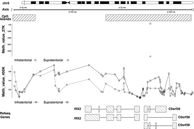 Other members of the Iroquois (IRO/IRX) family, IRX1, IRX3 and IRX5 have been found differentially methylated [5, 20] and/or expressed [5, 16, 18, 20] between supratentorial and infratentorial PAs, suggesting that these genes may have an important role in specific location cancer development.