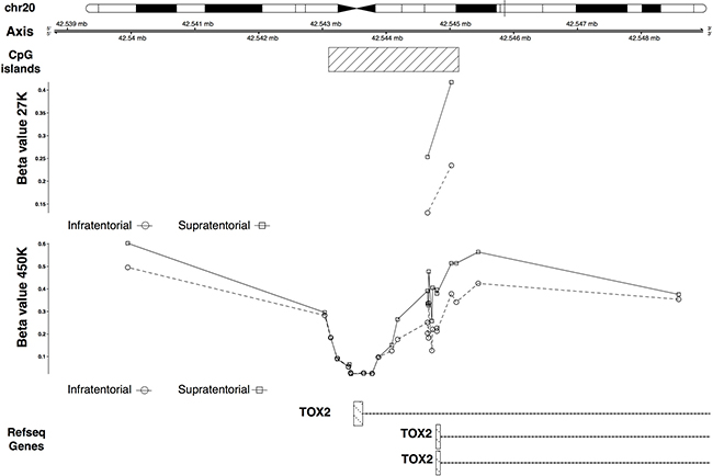 Another developmental gene, EN2, showed a differential methylation and expression between supratentorial and infratentorial PAs.